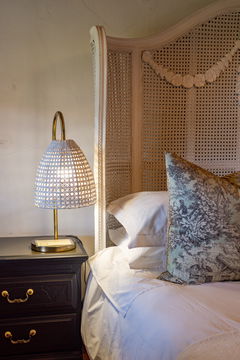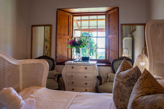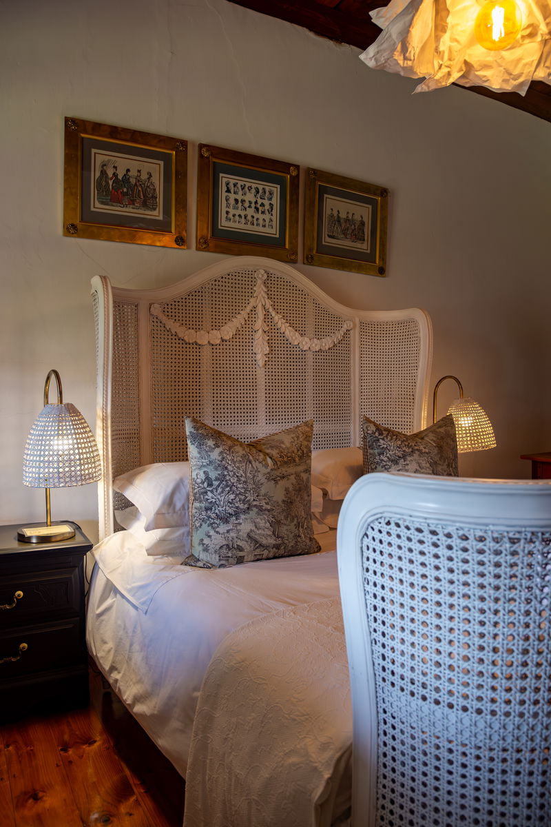 This room with its beautiful garden view through an oregon pine sash window has a queen size French rattan bed. It has real authentic feel with thick yellowwood and pearwood ceiling and an oregon pine floor.