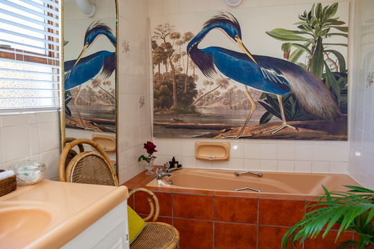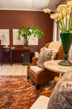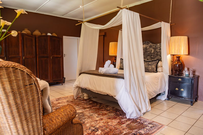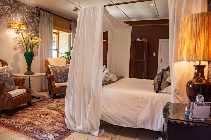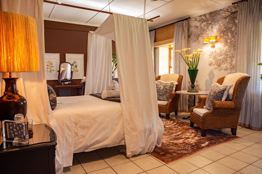 It is a spacious main room with a queen bed and four poster drapes with luxurious furniture, Persian carpet and en-suite bathroom.