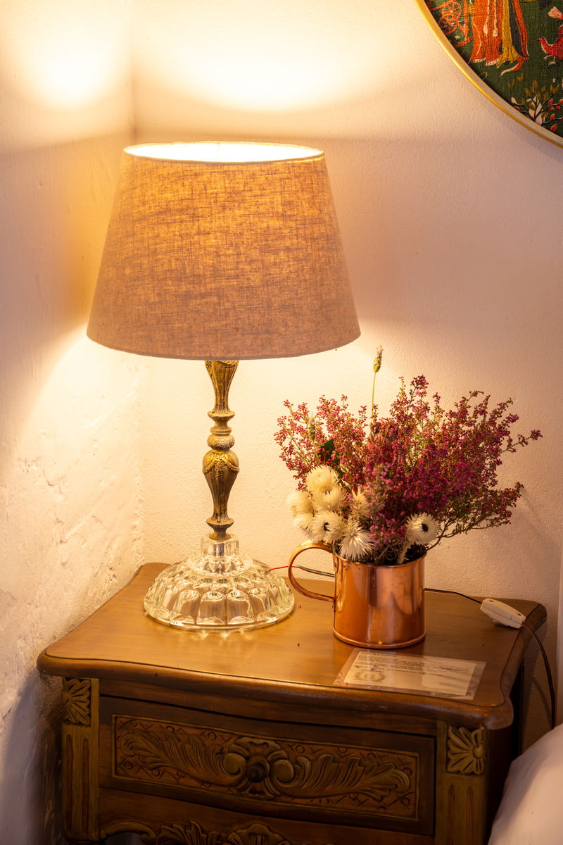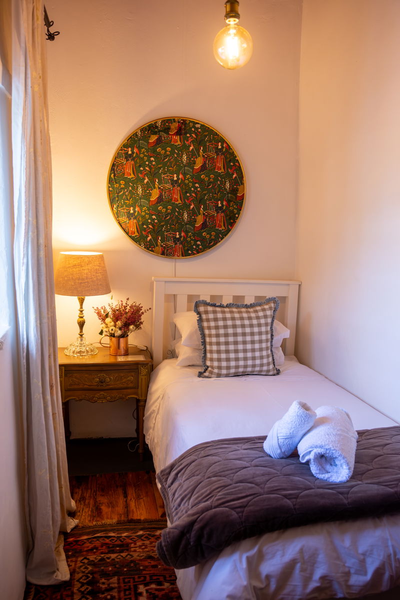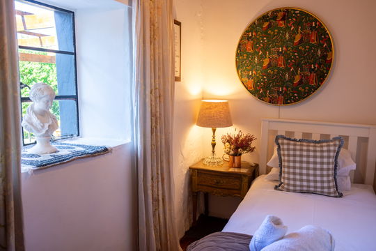 The fourth bedroom with its good quality single bed are very cosy with a thick rug, st Legger and viney curtains, a beautiful, old-world built-in bookcase and bedside table with a copper bedside lamp The 80cm thick wall window look out over the vegetable garden.