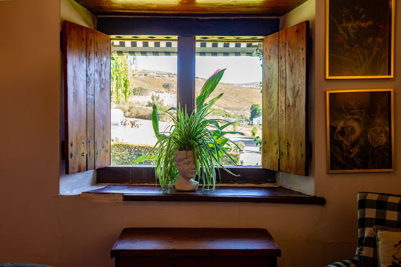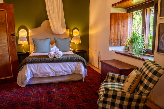 This room with its 80cm thick walls, wide yellowwood inside door and oregon pine outside door going out on the front porch is the oldest room in the house. It is a beautiful room with a large window sill looking out on the garden. The ceiling is yellowwood and stinkwood and so authentic.